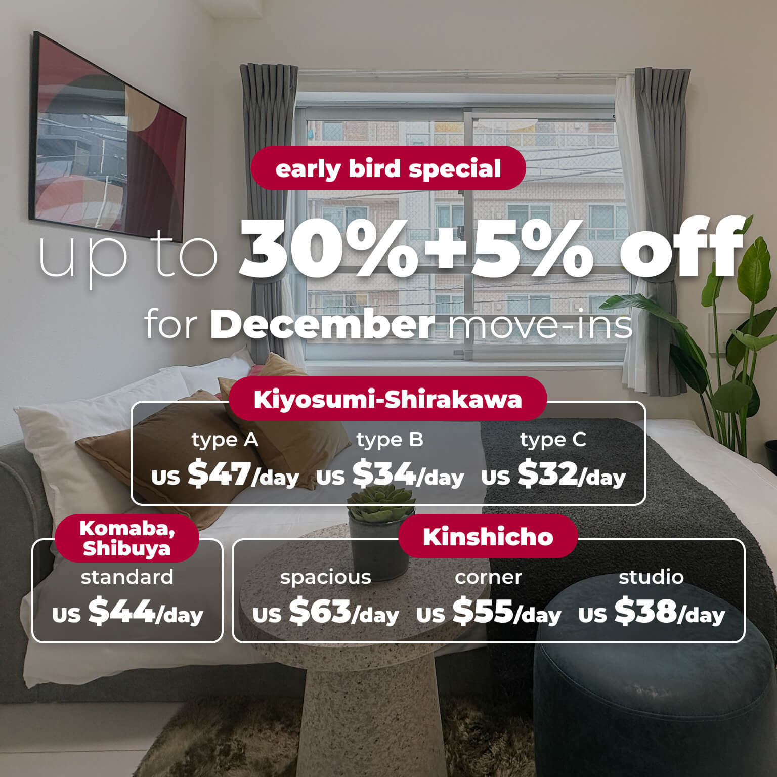 Browse our rental spaces at special rates to find your ideal home in Tokyo